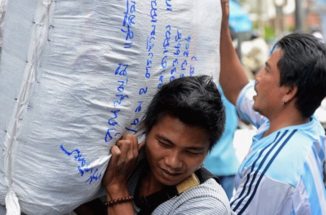 Công nhân khuân vác tại một khu chợ ở thủ đô Bangkok, Thái Lan. Ảnh: AP